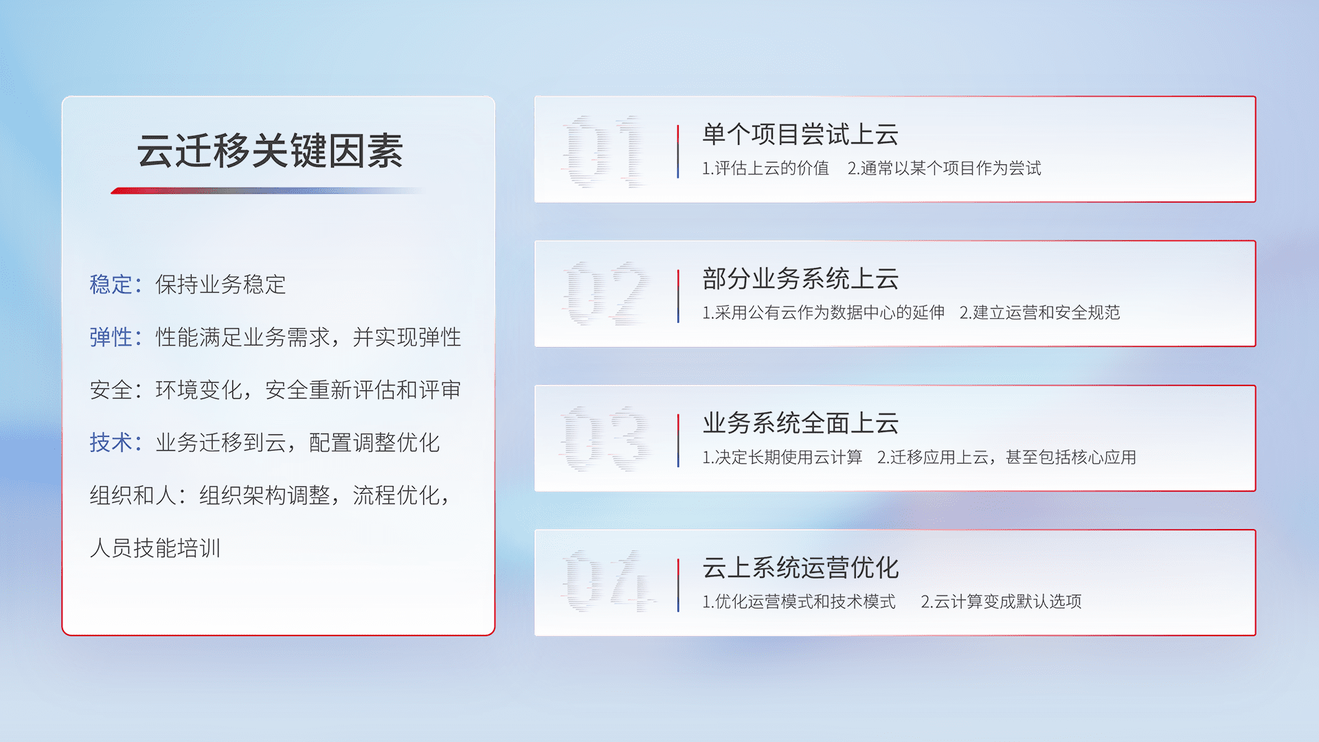 结合实际业务,,,,从规划设计、、云平台选型、、云原生改造、、数据迁移、、、集成交付,,迁移全过程为客户识别最佳上云路径,,做好风险识别管理,,,,设计网络架构、、、、身份权限、、、、安全审计合规、、、、操作审计、、日志审计、、监控告警策略、、多站点容灾设计等,,,,对云上基础设施进行整体规划,,,提升IT治理水平,,以满足弹性、、、、高可用、、、高性能的需求。。。。