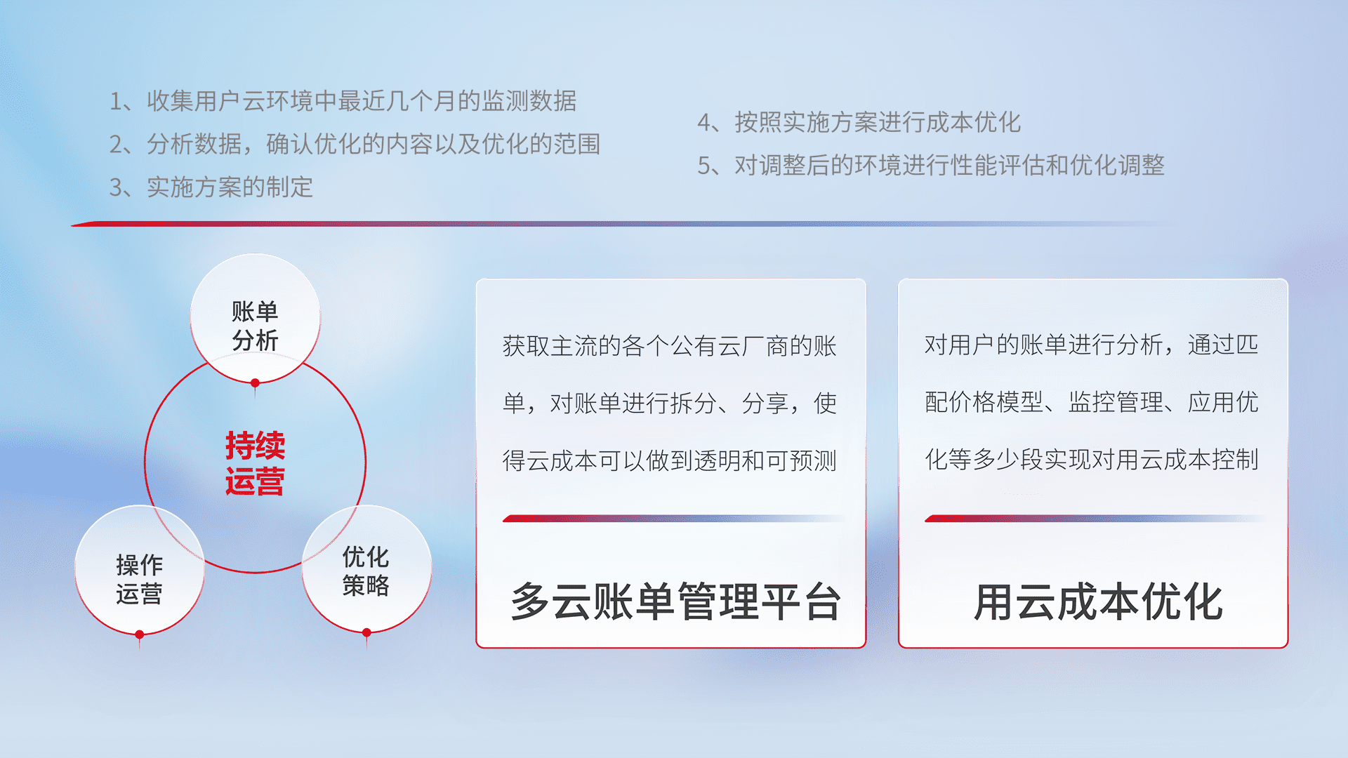 通过多云纳管,,,以统一的资源数据模型把客户的云资源进行抽象和封装,,,,进而实现对多云资源的统一操作,,保障云资源管理的可靠性、、稳定性与可用性。。量身定制化运维内容,,,,配置、、、开发运维、、补丁管理、、、、备份、、、、监控、、认证和访问管理、、、审计和日常巡检等,,,,保障在用云过程中的可靠度,,稳定度以及高可用率。。。