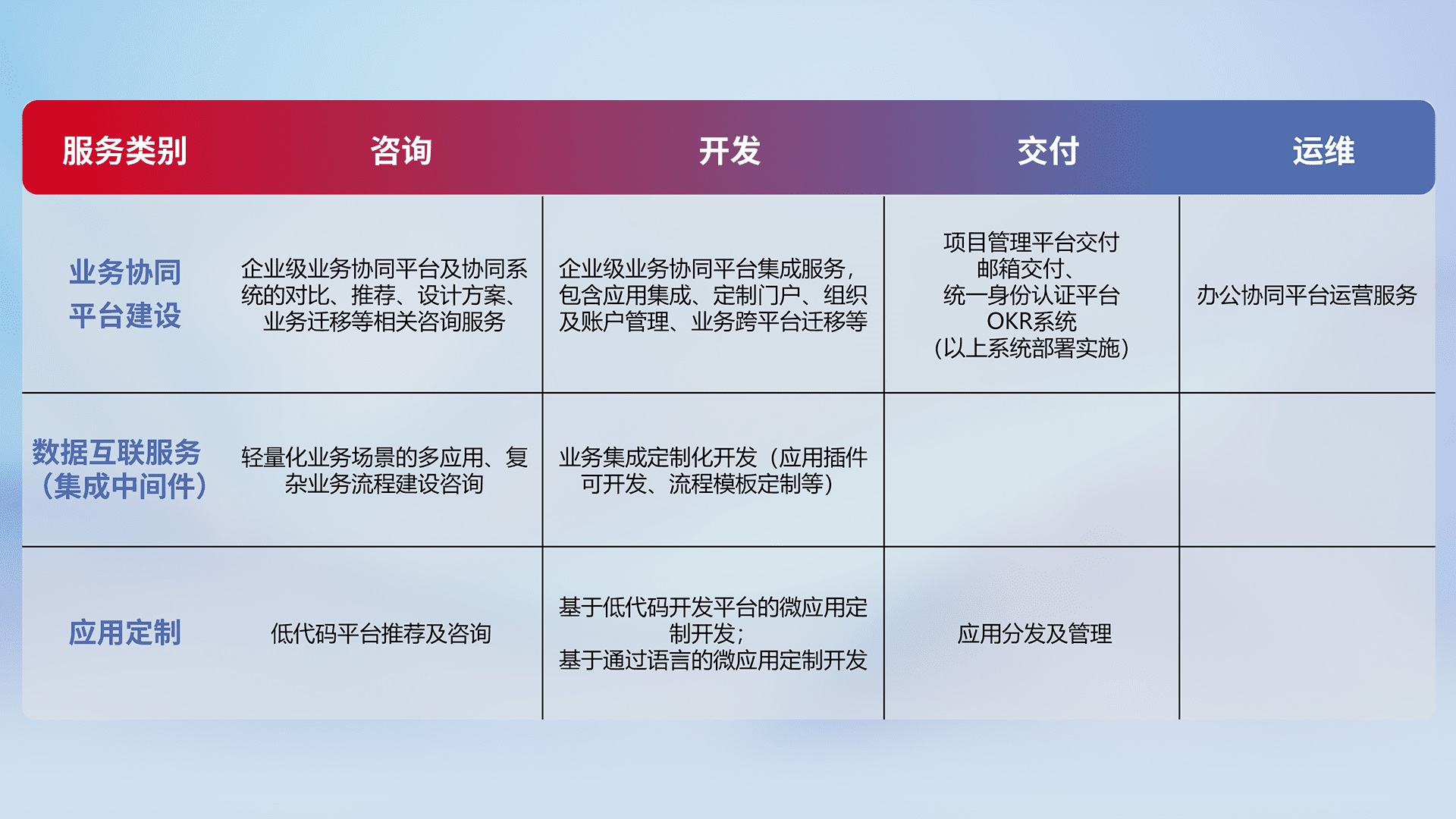 针对钉钉、、企微、、、、IDaas等平台级产品提供产品的规划、、、、方案、、、交付、、定制化开发等服务,,,,实现如统一协同办公、、、、智能客户服务、、、、混合会议管理、、、智能数据查询、、等业务场景,,实现数字化转型。。。